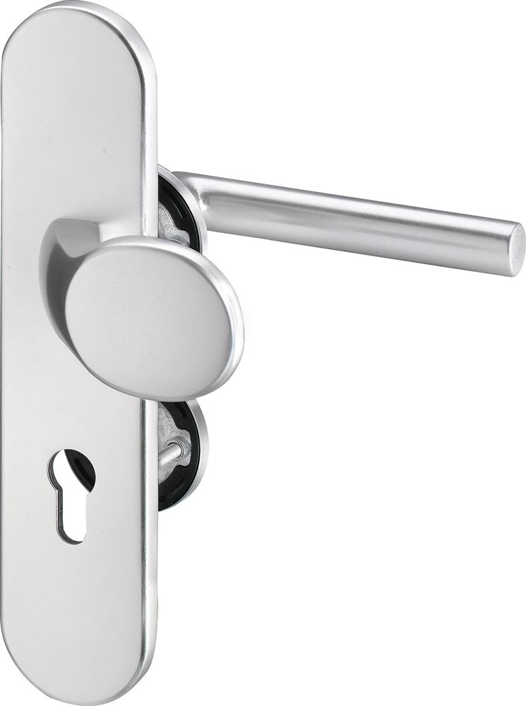 Kombi-Schutzgarnitur mit Rosettenverschraubung · Grundkonstruktion: innen = Stahl, außen = Druckguss, bei Ausführung mit ZA = massives Aluminium · Ausführung Innenrosetten: Ø 55 mm, Stärke 8 mm · Drücker-Lagerung: lose · Drückertyp und -stärke: 108 mit Ø 22 mm · Knopfausführung: K2 (gekröpft) · Stütznocken: M5, Ø 8 mm · Verschraubung: 4-fach M5, verdeckt · Spezialrollenwechselstift mit M12-Gewinde · Widerstandsklasse ES1 · Modell 8742 = Außenschild mit Anbohrschutz und Zylinderabdeckung: federnd gelagert für 11 - 14 mm Überstand · Entfernung 72 mm · DIN links / rechts · Vierkant 8 mm · Wechselgarnitur