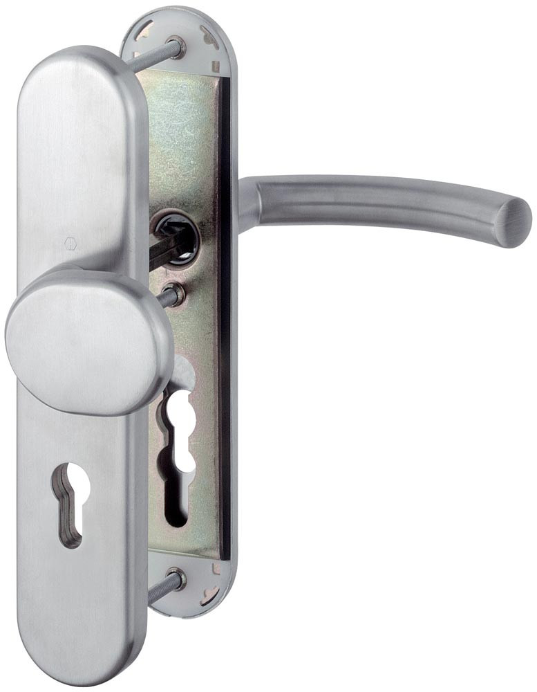 für Abschlusstüren · geprüft nach DIN 18257 · Stahl-Unterkonstruktion im Außen- und Innenschild · mit Rückholfeder-Paket · Wechselgarnituren mit gekröpftem Knopf · feststehend (ummontierbar) · mit Schnellstift-Verbindung · hochfeste, verdeckte Verschraubung · Lochung PZ · einschließlich Befestigungsmaterial M 6 · Anschlagrichtung DIN links / rechts · Widerstandsklasse ES 1