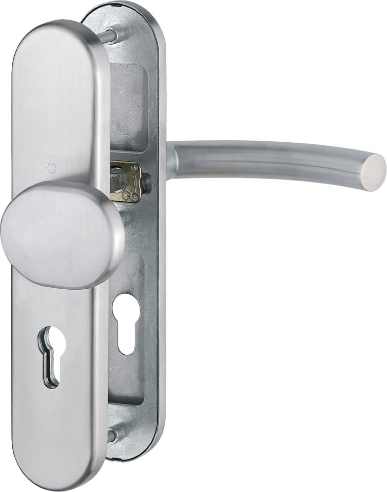 für Abschlusstüren · geprüft nach DIN 18257 · Stahl-Unterkonstruktion im Außen- und Innenschild · mit Rückholfeder-Paket · Wechselgarnituren mit gekröpftem Knopf · feststehend (ummontierbar) · mit Schnellstift-Verbindung · hochfeste, verdeckte Verschraubung · Lochung PZ · einschließlich Befestigungsmaterial M 6 · Anschlagrichtung DIN links / rechts · Widerstandsklasse ES 1