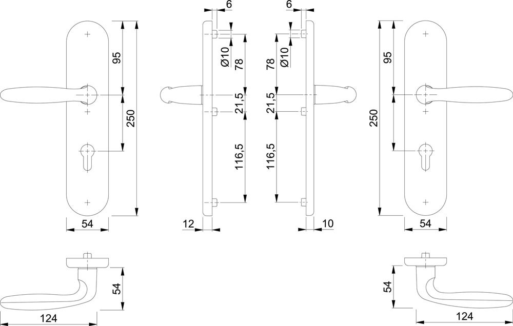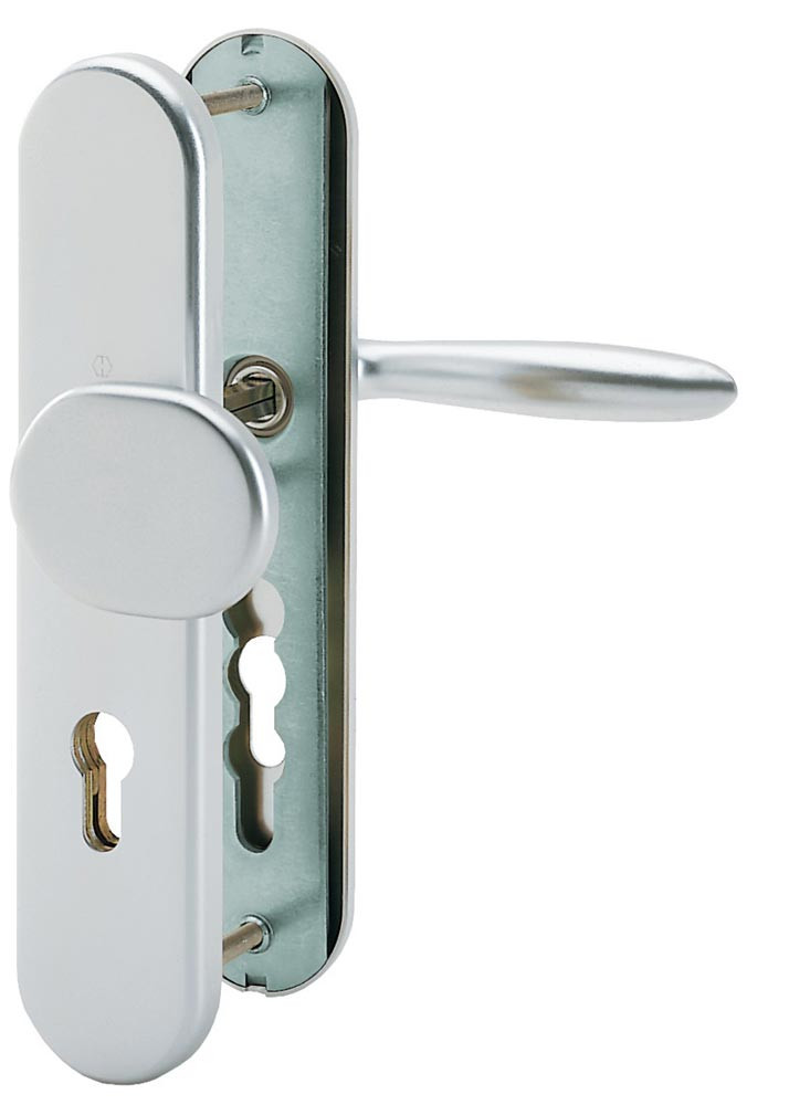 für Abschlusstüren · einbruchhemmend nach DIN 18257 · Stahl-Unterkonstruktion im Außen- und Innenschild · mit Rückholfeder-Paket · außen: gekröpfter, feststehender Kopf (ummontierbar) · innen: loser Türgriff, mit Schnellstift-Verbindung · hochfeste, verdeckte Verschraubung · Knopfschild-Randhöhe: 12 mm · DIN links / rechts · Widerstandsklasse ES 1