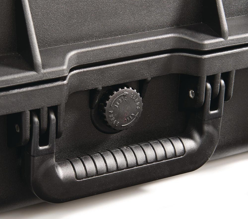 schwarz · luft- und wasserdicht · mit vorgerasteter Schaumeinlage zur leichten individuellen Gestaltung des Innenraums · Schlösser, Lufteinlassschraube, Tragegriff, shock-proof · aus schlagfestem Kunststoff · Verschlussmöglichkeit mit zwei Vorhangeschlössern · (Vorhangeschlösser gehören nicht zum Lieferumfang)