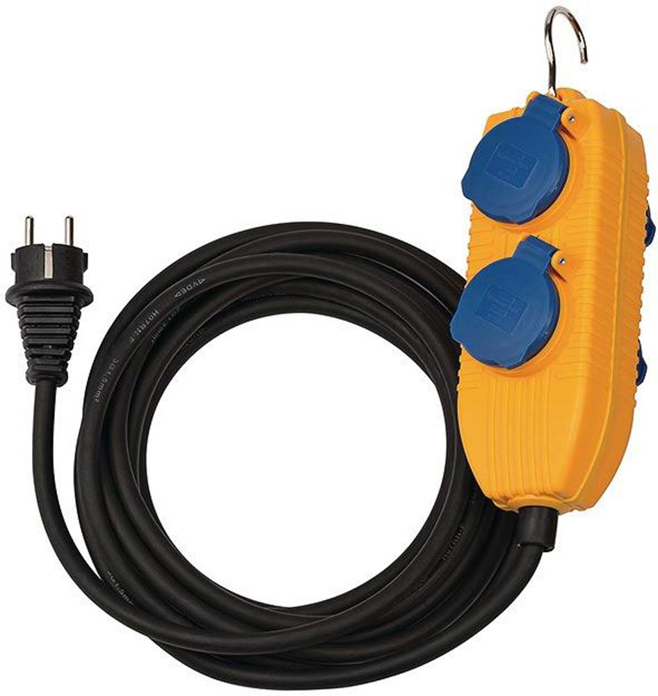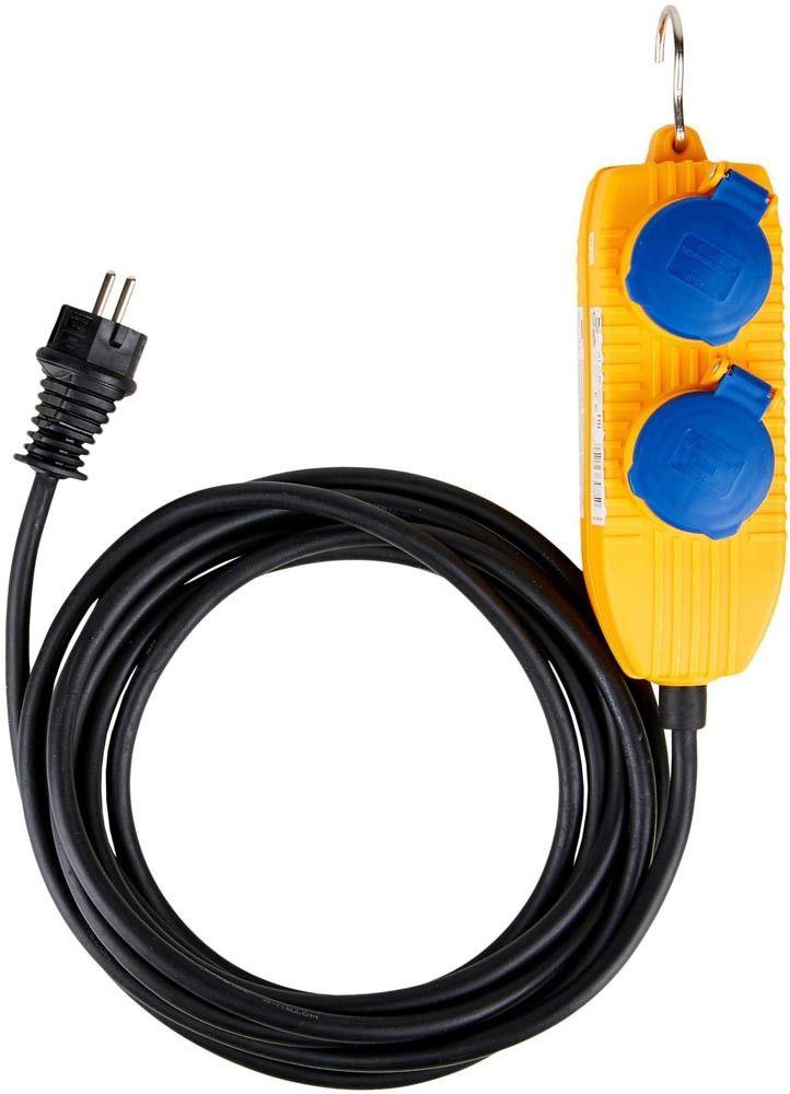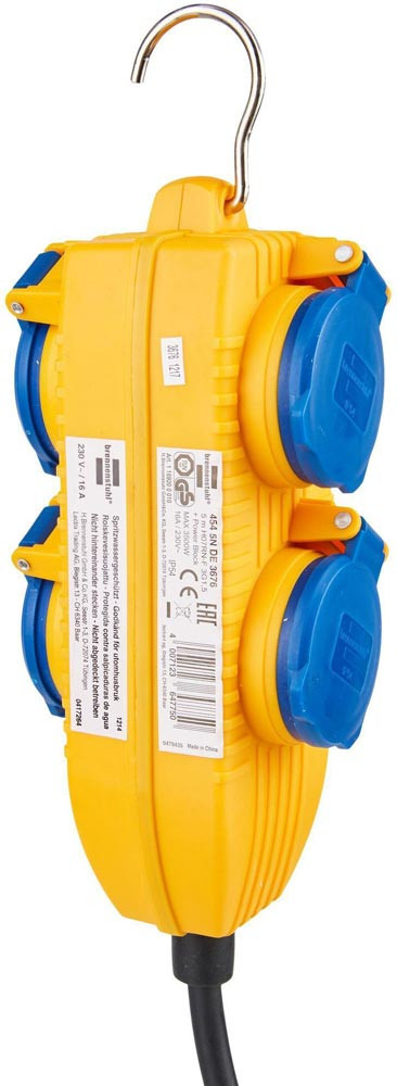 4 spritzwassergeschützte Schutzkontakt-Steckdosen mit selbstschließenden Deckeln · mit stabilem, einklappbarem Metallhaken · Gummikabel H07RN-F