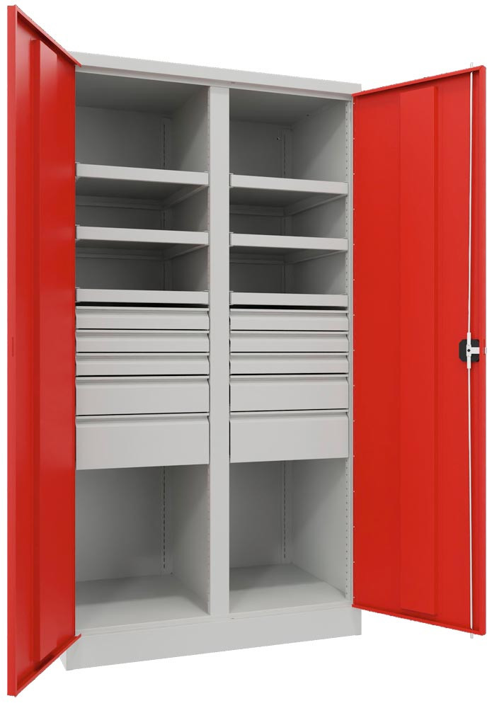 Schwerlastschrank, Vollblechtüren, m. Trennwand, 6 Böden, 200 kg Traglast, 4 Schubl. 175 mm, BxTxH 1040x630x1950 mm, RAL 5010 E6490079