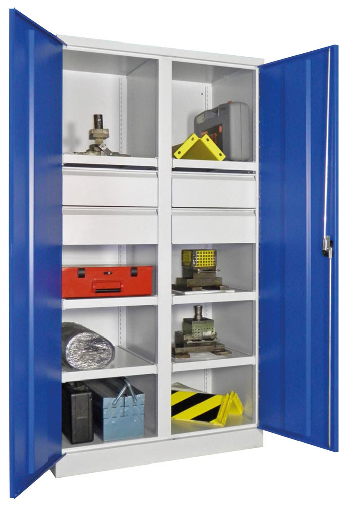 Schwerlastschrank, Vollblechtüren, mit Trennwand, 6 beschichtete Böden, 4 Schubl. 175 mm, BxTxH 1040x630x1950 mm, RAL 7035/5010