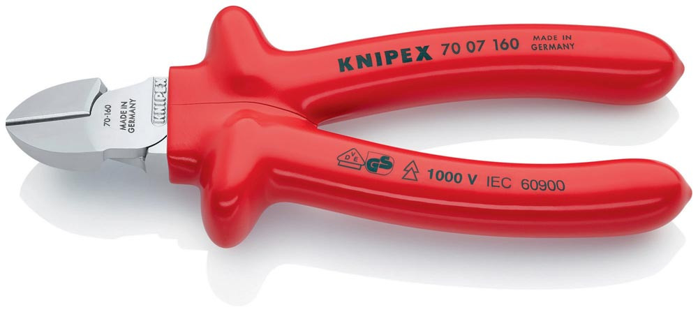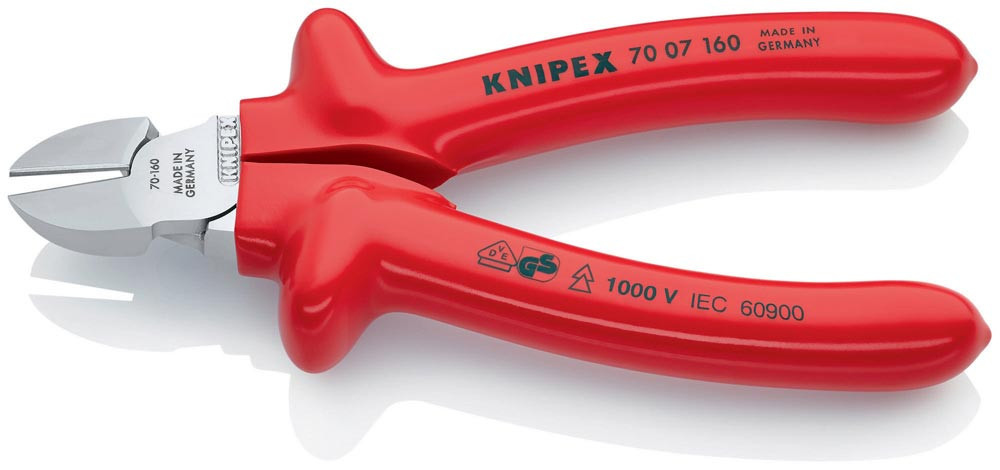 VDE-isoliert bis 1000 V · gefertigt gem. DIN EN/IEC 60900, stückgeprüft · schlanke Kopfform · sauberer Schnitt bei dünnen Cu-Drähten, auch an den Schneidenspitzen · Schneiden zusätzlich gehärtet, Schneidenhärte ca. 62 HRC · Vanadin-Elektrostahl, geschmiedet, mehrstufig ölgehärtet