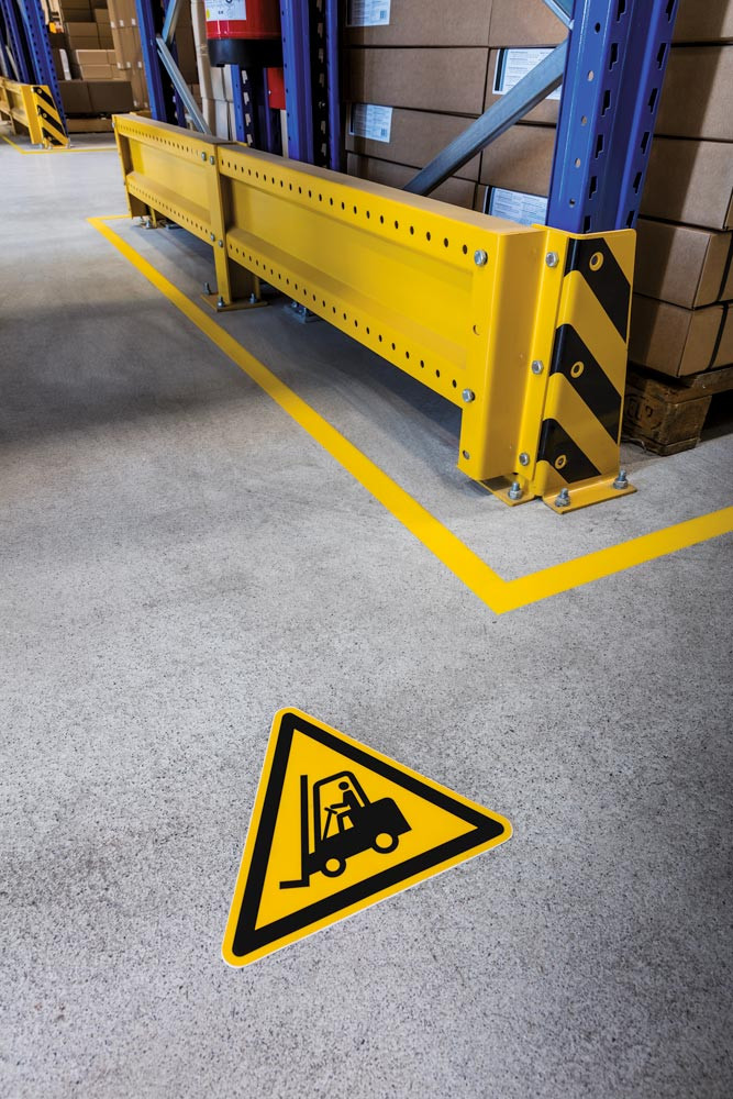 Sicherheitskennzeichen, selbstklebend, Warnung vor Flurförderzeugen, Kantenlänge 430 mm, VE 1 Stück, Mindestbestellmenge 2 Stück