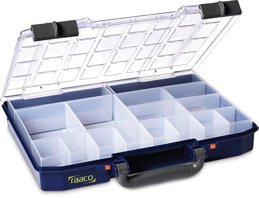 aus schlagfestem Polypropylen / Polycarbonat · kein Verbeulen · kein Rosten · keine scharfen Kanten und Ecken · der Deckel aus unzerbrechlichem Polycarbonat hat ein Raster auf der Innenseite, das das Verrutschen kleinster Teile verhindert · mit ergonomischem Tragegriff · mit herausnehmbaren Fach-Einsätzen