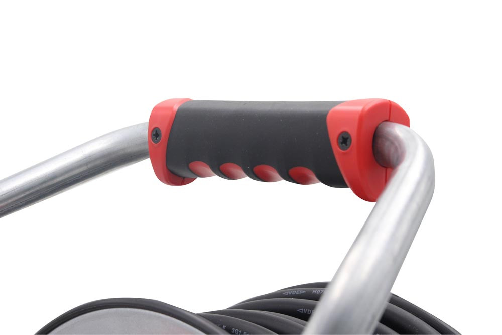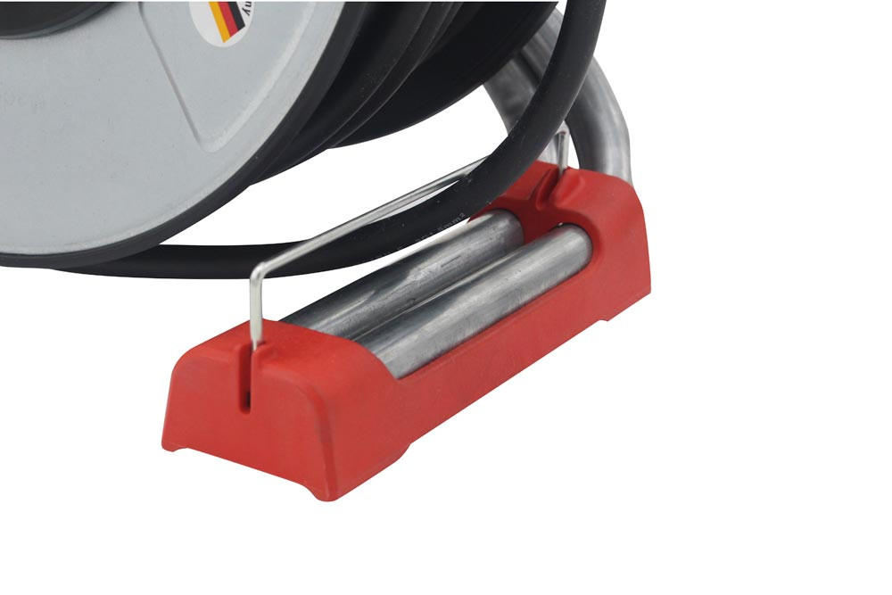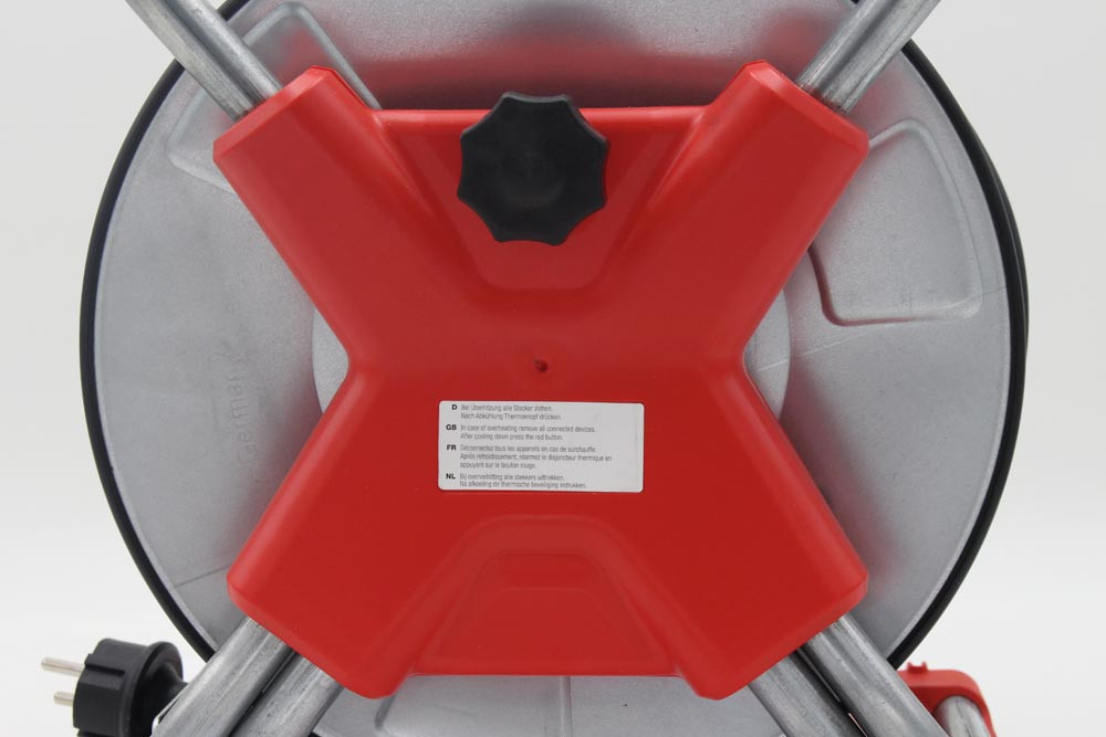 Ausführung: Trommelkörper aus feuerverzinktem Stahlblech mit spezieller Schutzisoliereung ∙ Mit stabilem, stoßdämpfendem X-Doppelrohrgestell mit Sterngriffbremse ∙ Ergonomischer, rutschfester 2-Komponentengriff und patentierter Leitungsführung ∙ Inklusive eingebautem Thermoschutzschalter ∙ Mit Schutzkontaktstecker und 3 Schutzkontaktsteckdosen mit Sicherheitsklappdeckel und Hammerzeichen ∙ Geprüft nach EN 61242, DIN VDE 0620-1, DIN EN 50525-2, IEC 60309 ∙ IP44