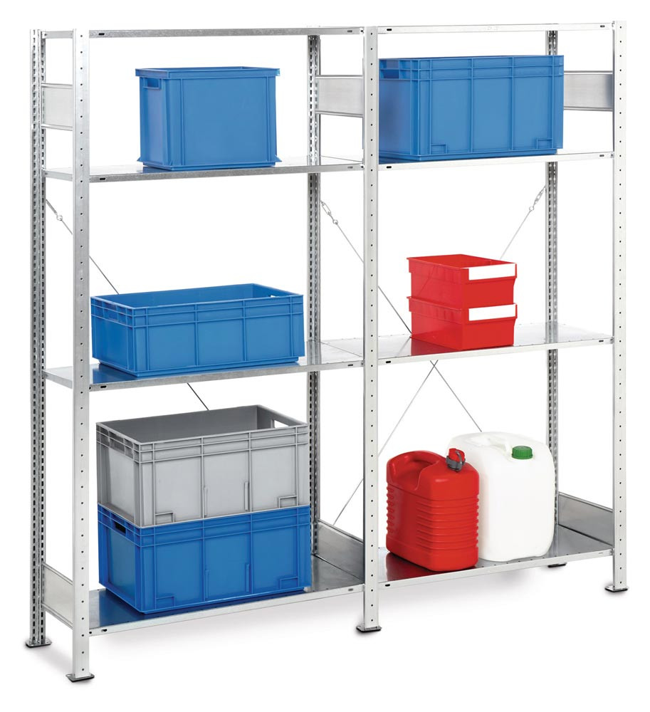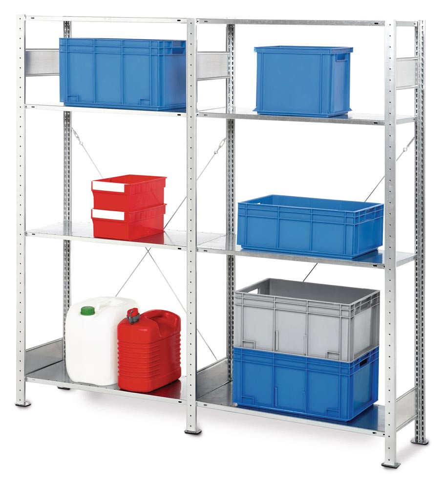 bestehend aus: 1 Grund- und 1 Anbauregal mit jeweils 4 Fachböden · verzinkt · Grund- und Anbauregal in Modulbauweise · einfache und schnelle Steckmontage mit vormontierten verzinkten Rahmen · Fachböden verzinkt mit verstärktem Kastenprofil, H 25 mm, höhenverstellbar im 25-mm-Raster · Tragfähigkeit pro Fachboden 150 kg · Feldlast 1300 kg (bei gleichmäßig verteilter Last) · Regalaußenmaße: