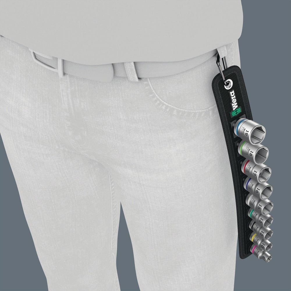 Außen-6-kant · robuster Textilgurt (Belt) im typischen Wera Design mit 9 Nüssen auf engstem Raum · leichtgängiger Drehmechanismus sorgt für einen sicheren Halt und leichte Entnahme der Nüsse · mit ″Take it easy″ Werkzeugfinder mit Farbkennzeichnung nach Größen - zum einfachen und schnellen Finden des benötigten Werkzeugs · inklusive Karabinerhaken zur Befestigung an Gürtelschlaufen oder Taschen · mit Vliesrücken und Klettklebestreifen zur einfachen Befestigung z.B. an Wand, Regal, Werkstattwagen und Wera 2go Werkzeugtransportsystem