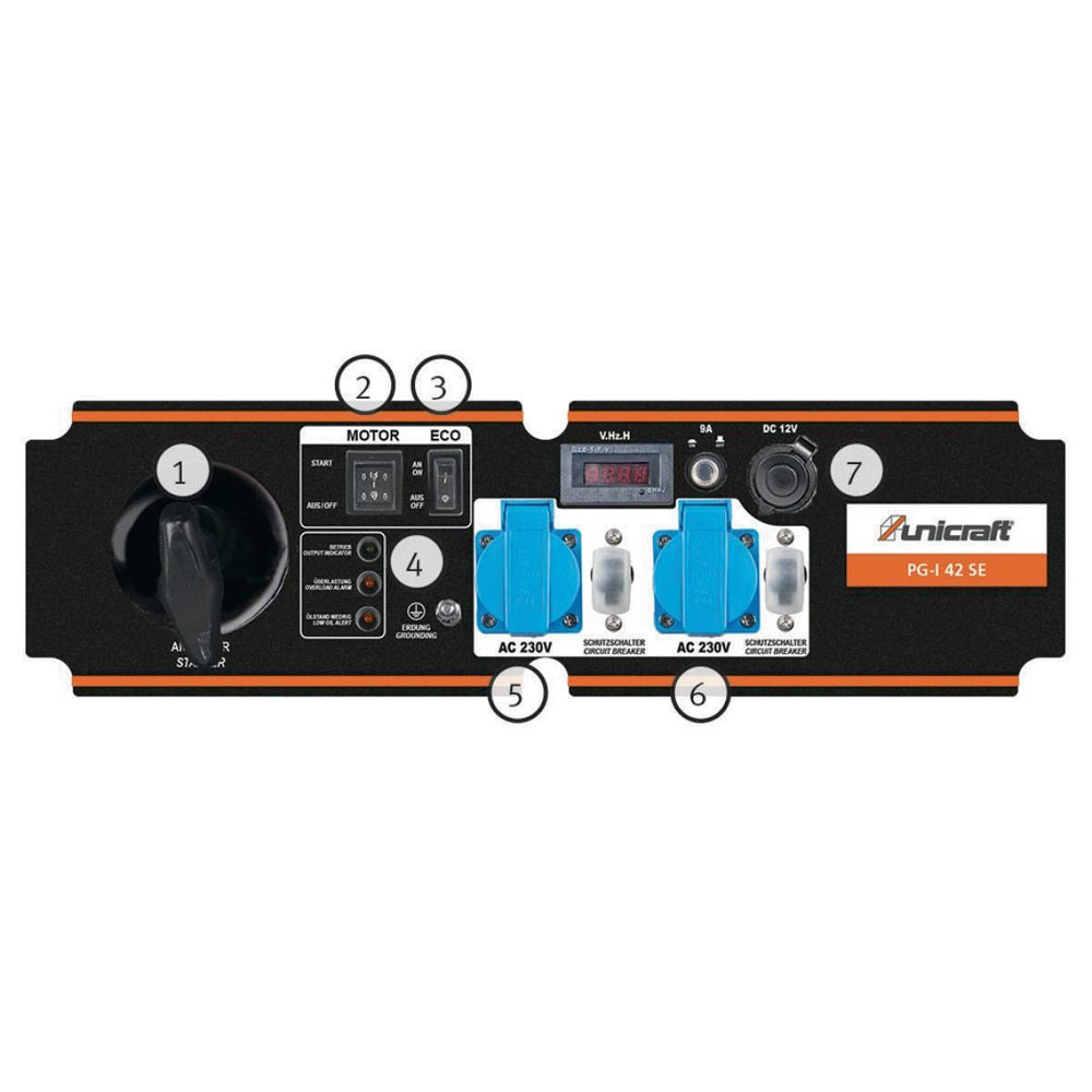 Invertertechnik für konstante Leistung · für Heim und Garten, Camping, Wohnwagene, Boote, Computer und andere empfindliche elektronische Geräte · Eco Modus regelt die Drehzahl je nach Stromverbrauch · Choke für problemlosen Kaltstart · Kontrollleuchten für Ausgangsspannung, Überlastung und Ölmangel · Überlastschutz durch Thermoschutzschalter ·