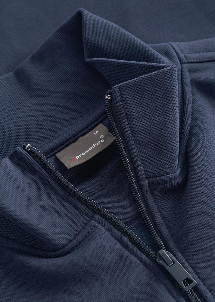 68% Baumwolle / 32% Polyester, ca. 325 g/m² · Halbmond im Nacken · Ton-in-Ton Reißverschluss am Kragen mit flauschig angerauter Innenseite · versetzte Seitennaht · Seitentaschen · Elastanbündchen an Ärmeln und Saum · exzellente thermophysiologische Eigenschaften durch angeraute 3-fädige Sweatware · erstklassige Waschergebnisse bei 60°C sowie trocknergeeignet · modern geschnitten · zertifiziert nach OEKO-TEX® Made In Green: M21LRMUH5