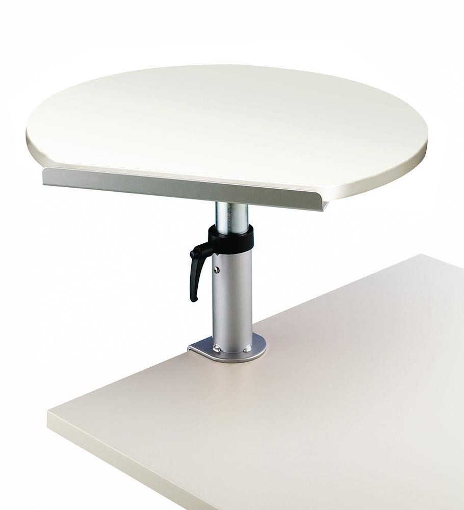 · Hochwertige Arbeitsplatte, besonders formstabil und leicht zu reinigen · Platte um 10° nach vorne neigbar und um 360° drehbar · Anschlagkante und Ablage für Stifte und Utensilien · Teleskopsäule aus Stahl, Ø 60 mm · Stufenlos höhenverstellbar · Fixierung ohne Kraftaufwand durch ergonomischen Klemmhebel · Klemmfuß, 100 mm breit, für Tischplatten bis 80 mm Stärke · Schreibtischschonende Unterlage · Höhe ab Schreibtischplatte 310-430 mm · Traglast 30 kg