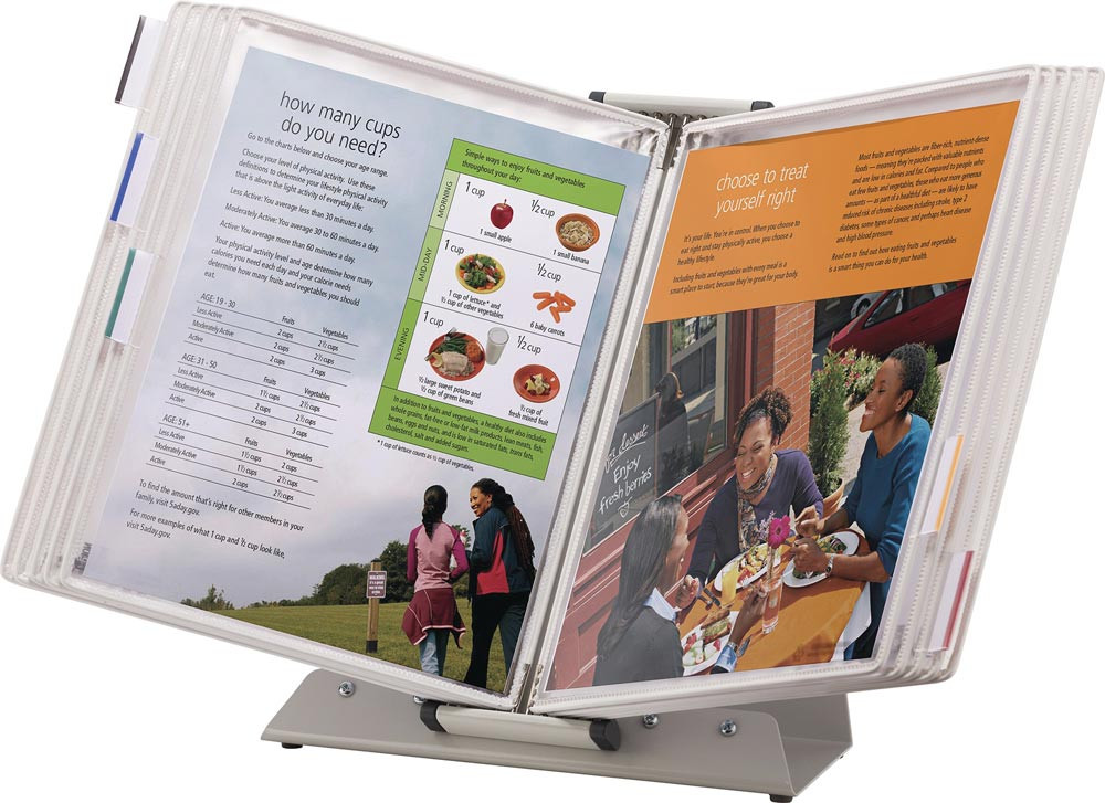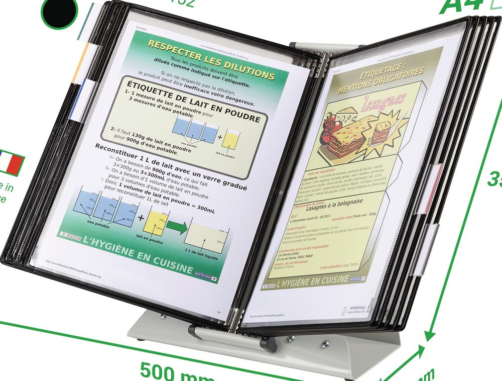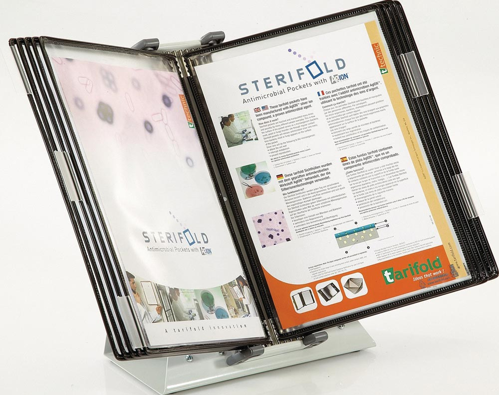 Komplett-Set · standfester Stahlblech-Tischständer, lichtgrau lackiert RAL 7035 (schräg gestellter Sockel) · mit 10 antibakteriellen Sichttafeln DIN A4 aus strapazierfähigem, flexiblem Kunststoff, mit kunststoffummanteltem Stahldraht · Öffnung oben · mit 5 Aufsteckreiter 50 mm · mit 4 Pluggers (Anschlagendstücke) für einen idealen Lesewinkel · kann mit 1 bis 2 Wandelementen auf 20 bis 30 Tafeln erweitert werden · Wandmontage möglich (Befestigungsmaterial nicht im Lieferumfang enthalten) · Sichttafeln Art.-Nr. 6463446: Farbe schwarz