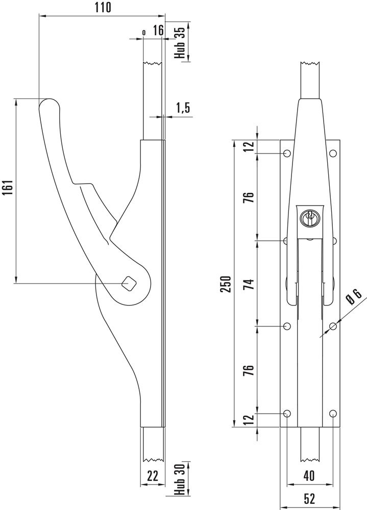 neutrales Design für alle baulichen Voraussetzungen · alle Kanten gerundet · für Vierkantstangen · Getriebekasten aus Stahl 1,5 mm tiefgezogen, galvanisch verzinkt · stabile Getriebeteile · inkl. 2 Schlüssel
