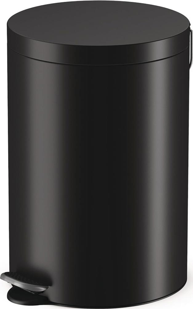 Gehäuse und Deckel aus korrosionsfest beschichtetem Stahlblech · "Soft Close"-Deckel-Schließ-Mechanismus · Deckelscharnier mit Tragegriff · innenliegende Tretmechanik · Design-Fußpedal aus Kunststoff/Metall · herausnehmbarer Inneneimer, Kunststoff schwarz