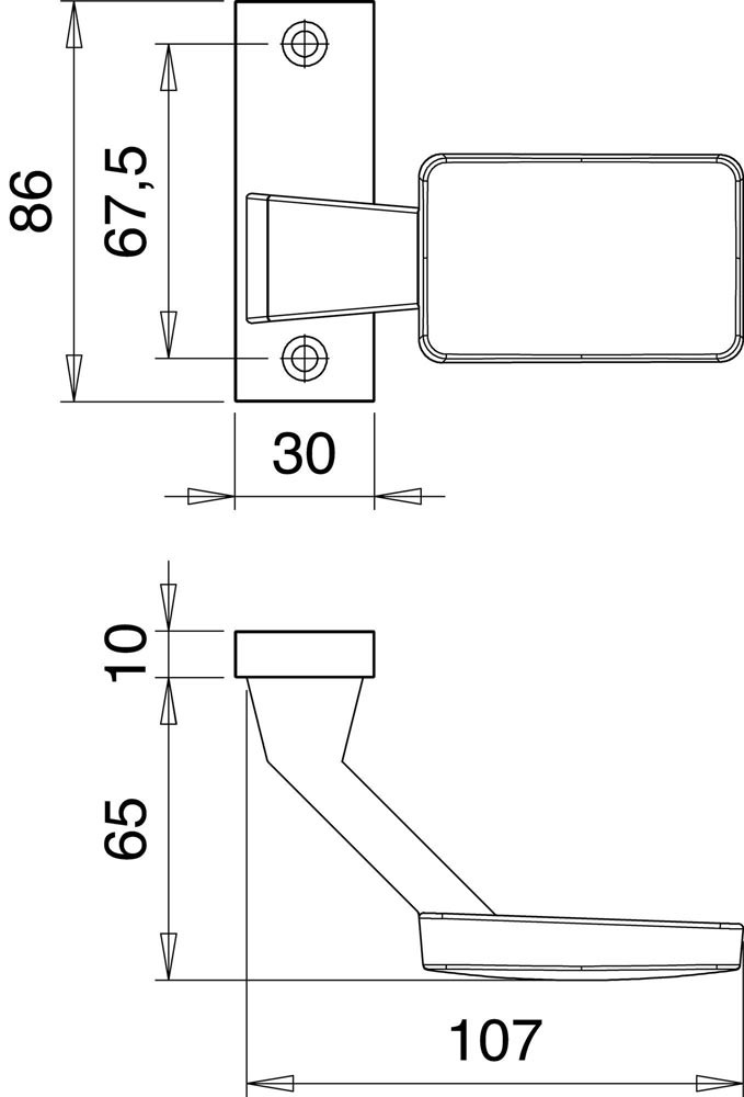 für Schlosskästen · Knopf eckig · Rosetten-Höhe 86,5 mm · Breite 30 mm · Stärke 10 mm · ohne Stift · Schraublochabstand 67,5 mm · DIN links / rechts verwendbar