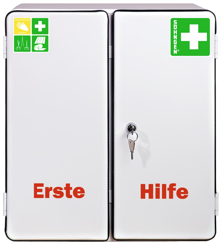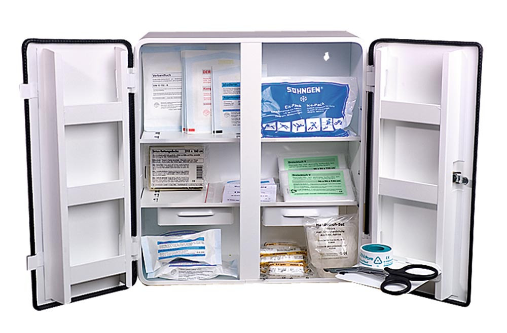 ∙ 404 x 462 x 170 mm ∙ Stahlblech, weiß lackiert ∙ Zweitürig ∙ Verschließbar ∙ 2 Einlegeböden ∙ 2 Schubladen ∙ 6 Türablagen ∙ Siebdruck und Piktogramme ∙ Komplett mit Füllung DIN 13157 ∙ Tür mit klappbarem Ablagetableau zur hygienischen Zwischenlagerung von Verbandmaterial bei der Erste-Hilfe-Leistung
