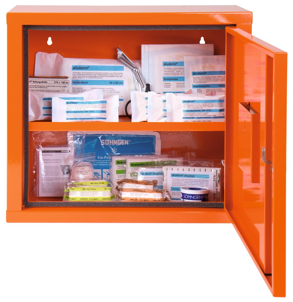 ∙ B x T x H 490 x 200 x 420 mm ∙ Qualitätsfeinblech, orange lackiert ∙ Eintüriger Verbandsschrank mir umlaufender Dichtung ∙ Sicherheitsschloss mit zwei Schlüsseln ∙ Notschlüsselfach ∙ Ein fester Fachboden ∙ Siebdruck und Piktogramme ∙ Komplett mit Füllung DIN 13157