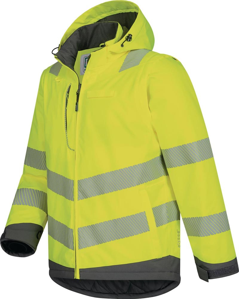 EN 20471 Kl. 3 (Weste separat Kl. 2) · EN 343 Kl. 4/1/X · EN 13688 · Obermaterial: 100% Polyester · Ripstop Atmungsaktivität:10.000 g/m²/24 h Wassersäule:10.000 mm · Ripstop Obermaterial ist wind- und wasserdicht, abrieb- und reißfest und hat einen leichten mechanischen Stretch · thermofixierte Reflexstreifen, keine zusätzlichen Nähte · leichte, atmungsaktive und sehr warme Wattierung Sorona® · YKK®-Fronttreißverschluss · separat als Weste tragbar · abnehmbare Sturmkapuze mit vorgeformten Schirm · elastische Innenbündchen an den Ärmeln · Innentaschen mit Klett