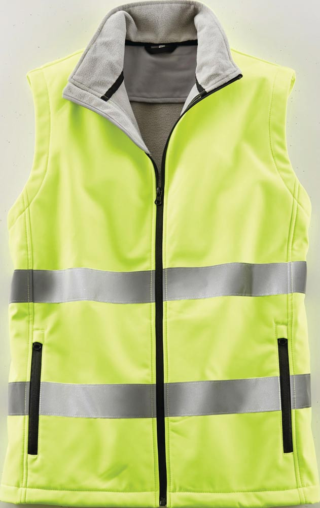 EN ISO 20471 Kl. 1 · 100% Polyester · Warnschutzweste aus Softshellware · mit TPU-Membran · weiche Fleece-Innenseite · zwei Einschubtaschen mit Reißverschluss · reflektierende Tapes · wind- und wasserabweisend, atmungsaktiv · Terrax Workwear Label