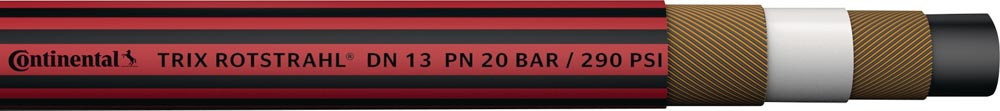 Kennzeichnung: 6 rote, axial verlaufende Streifen auf schwarzem Untergrund, „Continental ContiTech TRIX-ROTSTRAHL® DN 13 PN 20 BAR / 290 PSI Made in Germany“