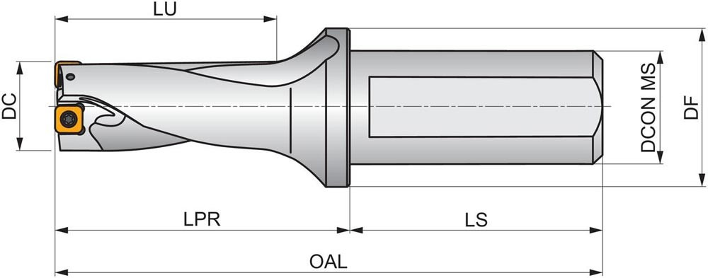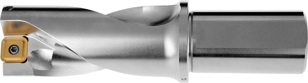 Wendeschneidplattenbohrer zum einsetzen von einer XPET 1504.. Wendeschneidplatten als Zentrumschneide und einer SCET 1505.. Wendeschneidplatte als Außenschneide · Bohrdurchmesser 2.000'' · mit einem 1.500'' abgeflachten Zylinderschaft nach ISO 9766 und Innenkühlung für maximale Bohrtiefen bis 2 x D
