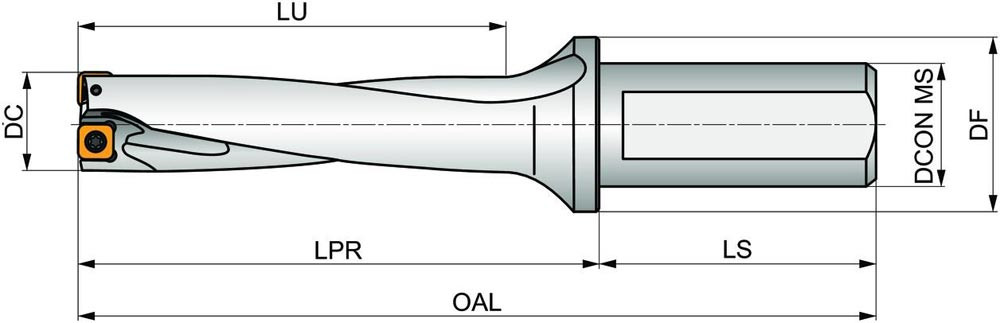 Wendeschneidplattenbohrer zum einsetzen von einer XPET 0502.. Wendeschneidplatten als Zentrumschneide und einer SCET 0502.. Wendeschneidplatte als Außenschneide · Bohrdurchmesser 0.625'' · mit einem 1.000'' abgeflachten Zylinderschaft nach ISO 9766 und Innenkühlung für maximale Bohrtiefen bis 4 x D