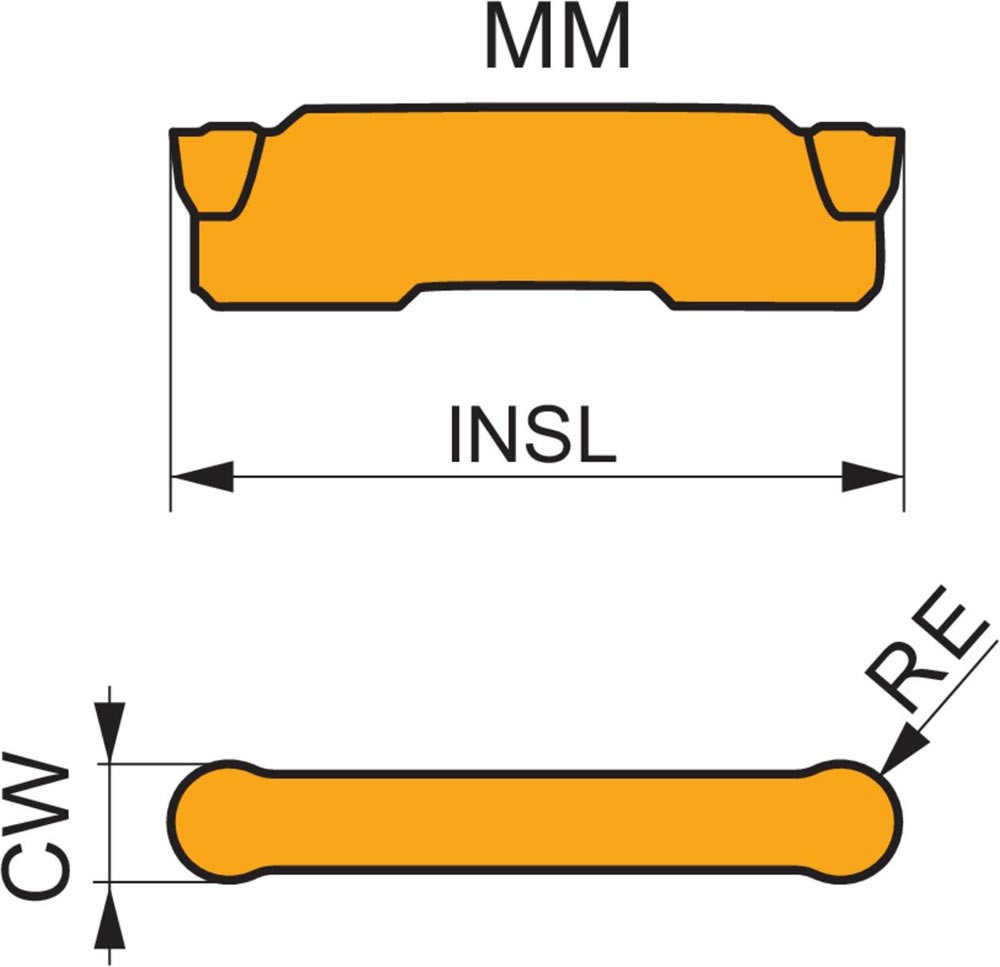 Doppelseitige Wendeschneidplatte zum Ein- und Abstechen · 25 mm lang · mit einer Schnittbreite von 2 mm und einem Vollradius von 1 mm und eine Schnittbreitentoleranz von ±0,05. Sorte T7325 MT-CVD-beschichtetes · funktional abgestuftes WC-Co-Hartmetall innerhalb der ISO-Sortenbereiche M10–M25 und K15–K25 für die Bearbeitung von Edelstahl und Gusseisen. MM Geometrie · Vollradius zum Kopieren und Längsdrehen · bei kontinuierlichen bis unterbrochenen Schnitten.
