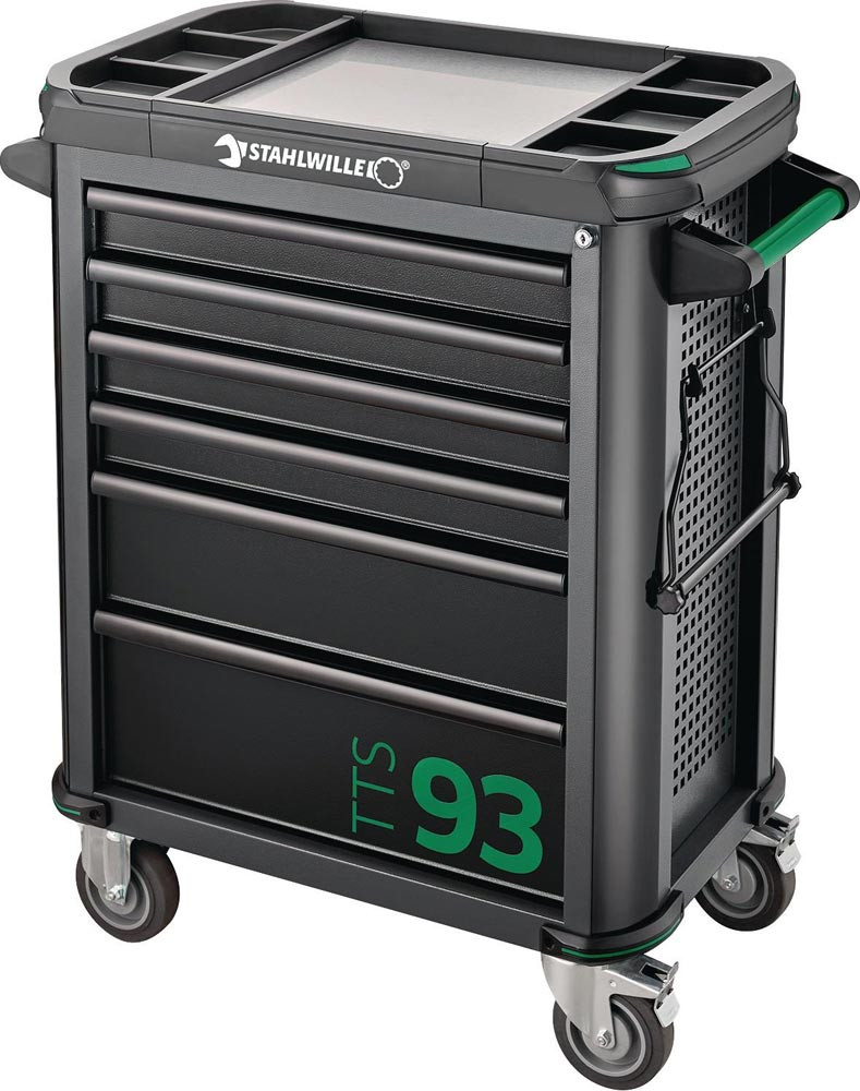 mit 6 auf kugelgelagerten Teleskopschienen herausziehbaren Schubladen mit 100 % Auszug · automatischer Schubladeneinzug · strapazierfähige Kunststoffablageplatte aus ABS · mit Fächer für Kleinteile · mit Zentralverriegelung durch Zylinderschloss (nur eine Schublade gleichzeitig geöffnet) · abschließbar mittels eingebautem Zylinderschloss mit abklappbarem Schlüssel · öl- und säurebeständige Leichtlaufräder (D.125 mm) mit Fadenschutz zum Schutz der Lager vor Schmutz und Fäden · zwei Feststellbremsen · beidseitiges Lochwandsystem für einfache Installation von Zubehörartikeln · mit Papierrollenhalter · 2 Fahrgriffe · aus Stahlblech