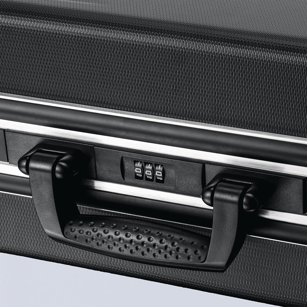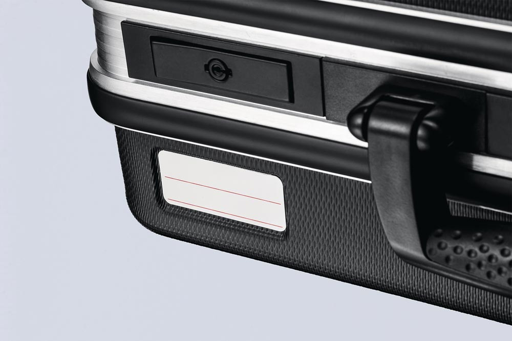 strapazierfähige Ausführung aus ABS-Material, schwarz · umlaufender Aluminiumrahmen · 3-stelliges Zahlenschloss und 2 Kippschlösser zur Fixierung das Deckels · stabiler, ergonomischer Tragegriff · Metallscharniere · Deckelhalter mit Scharniermechanik · Dokumentenfach im Deckel · herausnehmbare Werkzeugtafel im Deckel mit 9 Werkzeugtaschen und einer elastischen Schlaufe auf der Deckelseite und 10 schmalen und einer großen Werkzeugtasche auf der Bodenseite · Bodenschale, Höhe 55 mm, durch Einsätze weiter unterteilbar und Abdecktafel mit 12 großen Werkzeugtaschen und ein Flachfach · per Druckknopf fixierbar · Belastbarkeit 15 kg