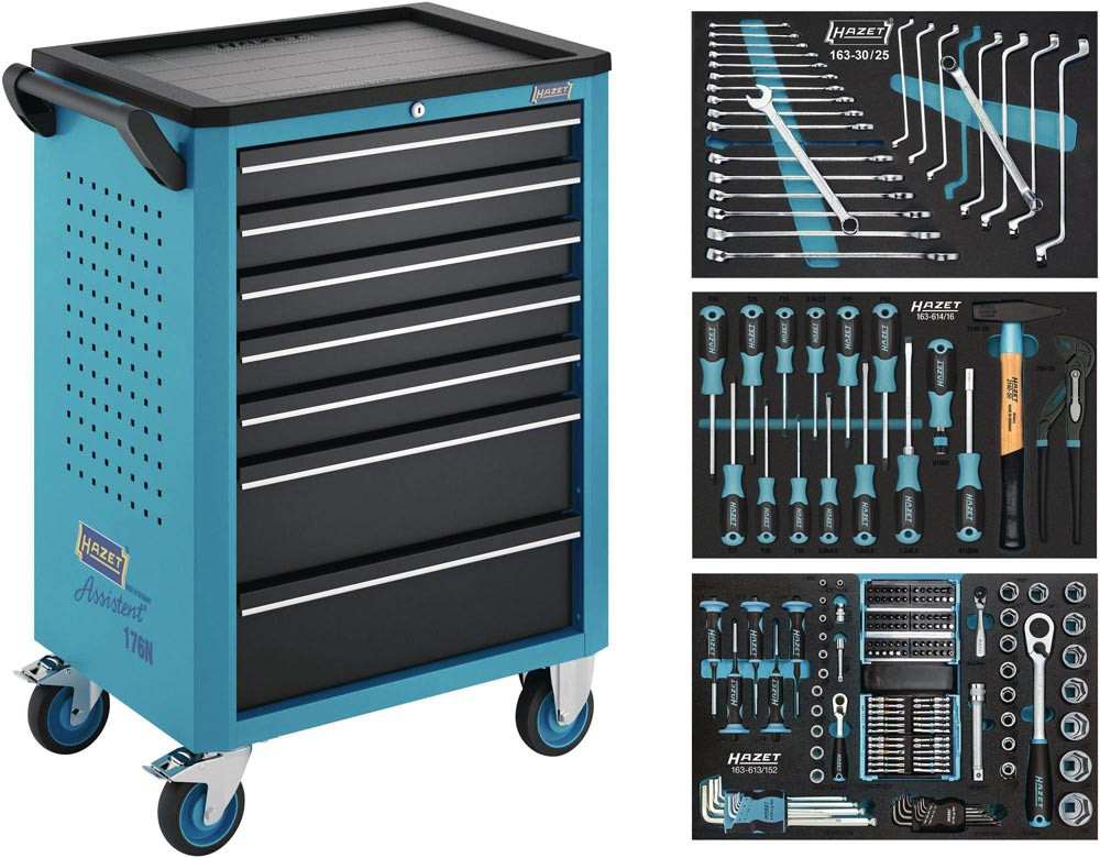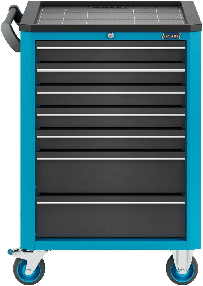 Anwendung: Effiziente · mobile Organisation von Werkzeug. Werkzeug- · Material- und Montagewagen. 5 flache und 2 hohe Schubladen. Komplett mit 147-teiligem Werkzeug Sortiment in Safety-Insert-System Weichschaumeinlage. Hohe Flexibilität. Griff und Rollen wahlweise links oder rechts montierbar. Praktisches HAZET Design. Griffleisten für angenehme Haptik. Kunststoffhaube mit Texturen und großer vertiefter · komplett nutzbarer Arbeitsfläche. Komplett abgedichtete Arbeitsfläche schützt Wageninneres bei auslaufenden Flüssigkeiten. Abgeschrägte Kanten vermeiden Beschädigungen. Zahlreiche Befestigungsmöglichkeiten. Zubehör · wie z. B. HAZET Papierkorb · Dosenhalter an linker und rechter Seite montierbar. Rückwärtige Schraubpunkt zur Montage von weiterem Zubehör. Arbeitsflächen. Deutlich vergrößerte Ablage- und Arbeitsfläche in Kunststoff. Modernes Oberflächendesign der Arbeitsfläche. Lösemittelbeständige Arbeitsfläche schützt Wageninneres bei auslaufenden Flüssigkeiten. Umrandung der Arbeitsfläche schützt Teile vor Herabfallen. Korpus / Fahrgriff. Extrem robuste Ausführung durch doppelwandige Konstruktion. Komplette Schweißkonstruktion des ganzen Korpus für den täglichen harten Werkstatteinsatz. Individuelle Befestigungsmöglichkeiten durch Quadrat-Lochraster auf Seitenwänden · z. B. für HAZET Hakenprogramm Artikelgruppe 112 für Werkzeuge oder andere Anbauteile wie z. B. Dosenhalter · Papierrollenhalter · Papierkorb · etc.. Stabiler Fahrgriff beidseitig fest am Korpus montierbar. Verriegelungs-Konzept. 2-stufige VerriegelungZentralverriegelung · abschließbar durch Zylinderschloss mit 2 Knickschlüsseln. Gegenseitige Auszugssperre für minimales Kipprisiko. Schubladen-Konzept. Gegenseitige Verriegelung der Schubladen verhindert ungewolltes Öffnen. 100 % Auszug mit Rollenführungen. Schubladendesign zur optimalen Nutzung des Innenraums. Schubladenfronten für optimiertes Handling. Schmutzunempfindliche Schubladen-Beschichtung zur einfachen Reinigung. Hochleistungs-Fahrwerk. Große stark belastbare Räder mit Präzisionskugellager und zweifachem Kugelkranz im Schwenklager · einfaches Bewegen auch bei hoher dynamischer Last. 2 Lenkrollen mit Doppelstopp: Gebremste Rollen verhindern Wegrollen. Gebremste Schwenklager verhindern Drehen der Lenkrollen · z. B. auf schrägen Flächen. Schutzring verhindert Eindringen von Schmutz und Fäden. Elastikrollen ermöglichen ruhigen Lauf. Gesamttragkraft (dynamisch): 480 kg. Gesamttragkraft (statisch): 480 kg. Traglast hohe Schublade: 20 kg. Farbe: HAZET blau. Maße: 780 mm x 498 mm x 1018 mm. (Schubladen)größe für Ordnungssystem: 3/3. Höhe Arbeitsfläche: 1002 mm. Anzahl Bockrollen: 2 (∅ 125 mm). Anzahl Lenkrollen: 2 (∅ 125 mm). Anzahl Werkzeuge: 147.