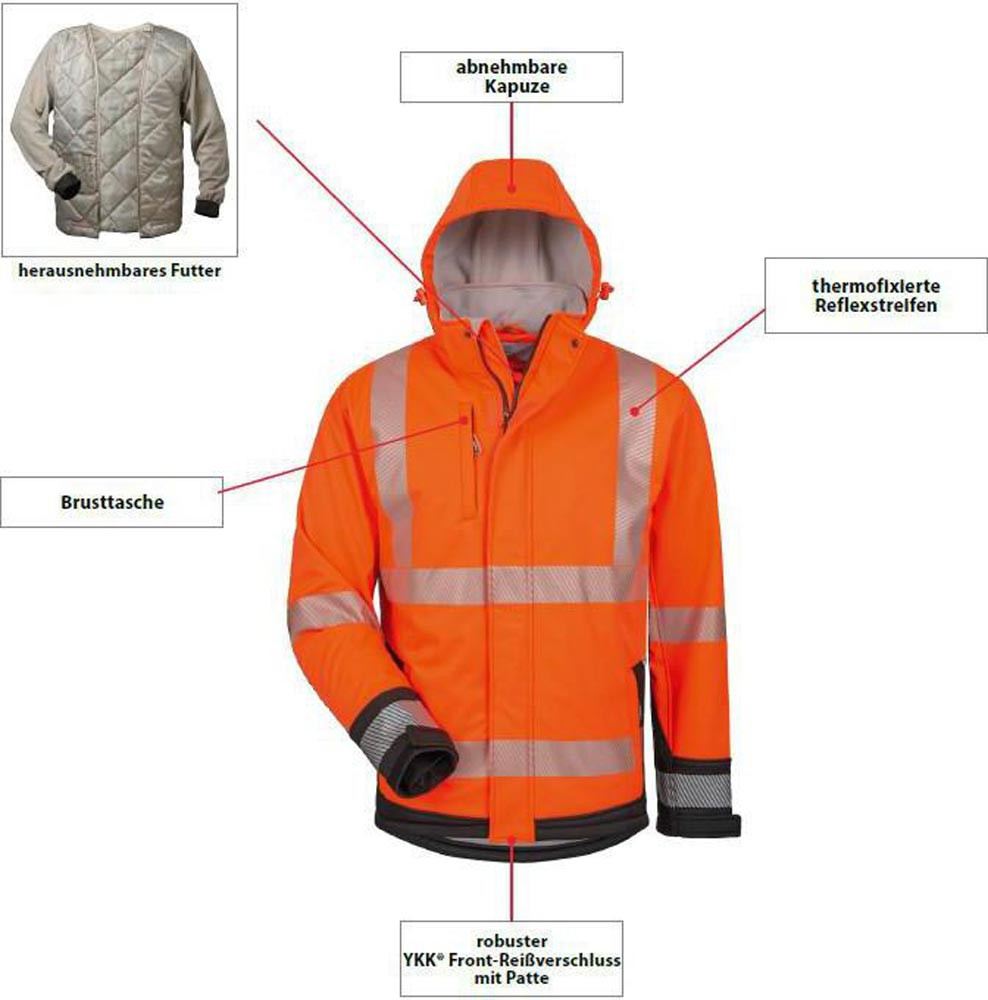 EN ISO 20471 Kl. 3 · EN ISO 13688 · Obermaterial: 100% Polyester, 3-Lagenlaminat (Softshell), Futter: 100% Polyester · Atmungsaktivität: 1000 g/m²/24 h · Wassersäule: 5000 mm · Futter: 100% Polyester · Softshell-Material ist wind- und wasserdicht, sowie atmungsaktiv durch 3-Lagenlaminat · robuster YKK®-Front-Reißverschluss mit Patte · hoch abriebfestes, robustes Softshellmaterial · thermofixierte Reflexstreifen, dadurch keine zusätzlichen Nähte · herausnehmbares, wärmendes Stepp-Innenfutter mit Strickbündchen an den Manschetten · Außenjacke mit weicher, bequemer Fleece-Innenseite · Reflexmaterial vorne, hinten, Schulter und Ärmel · einfache Emblem-Anbringung durch herausnehmbares Futter · 2 Taschen · 1 Brusttasche · 1 Innentasche