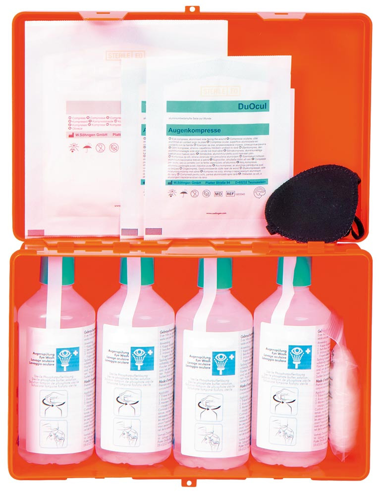 ∙ 4 gebrauchsfertige Druckspülflaschen à 250 ml plus Sofortset für Augenverletzungen mit DuOcul-Augenkompressen, Augenklappe, Silk-Pflasterstreifen, DERMOTEKT®-Kompresse und Einmal-Schutzhandschuhen ∙ Kunststoffbox B x T x H ca. 260 x 160 x 80 mm inkl. Wandhalterung